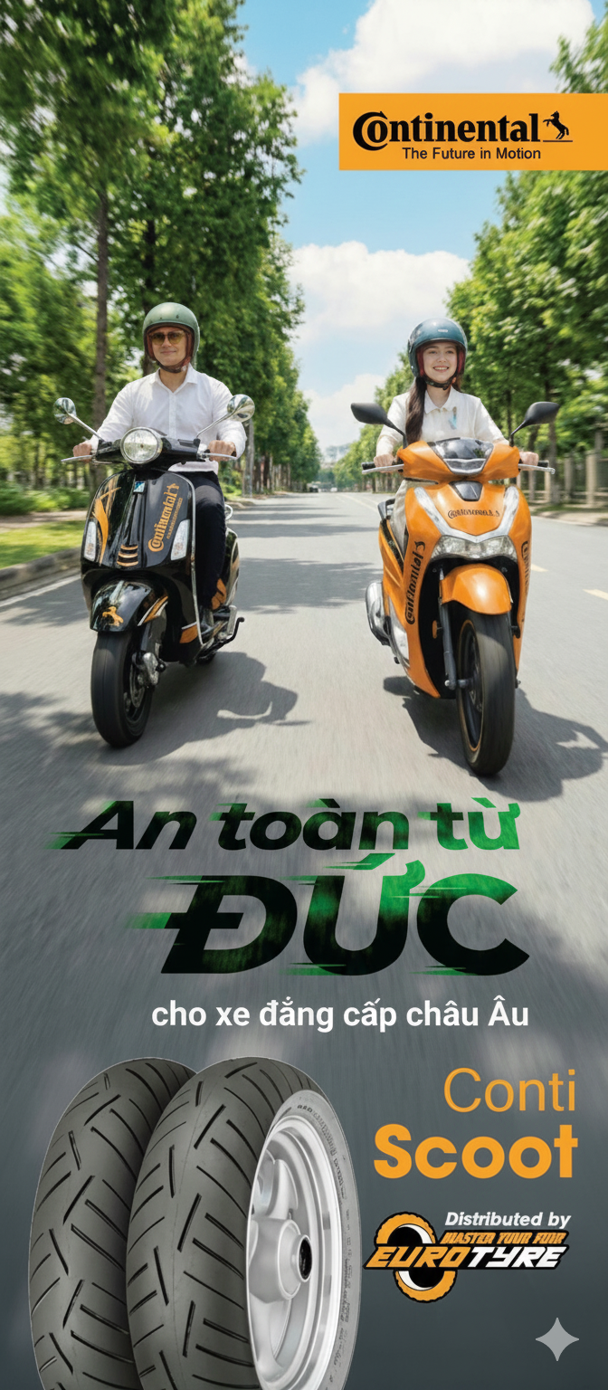 - Giải pháp ContiScoot: Hợp chất cao su của Continental cho phép bám đường ngay từ những mét đầu tiên (Cold Grip), bất kể trời lạnh hay nóng.